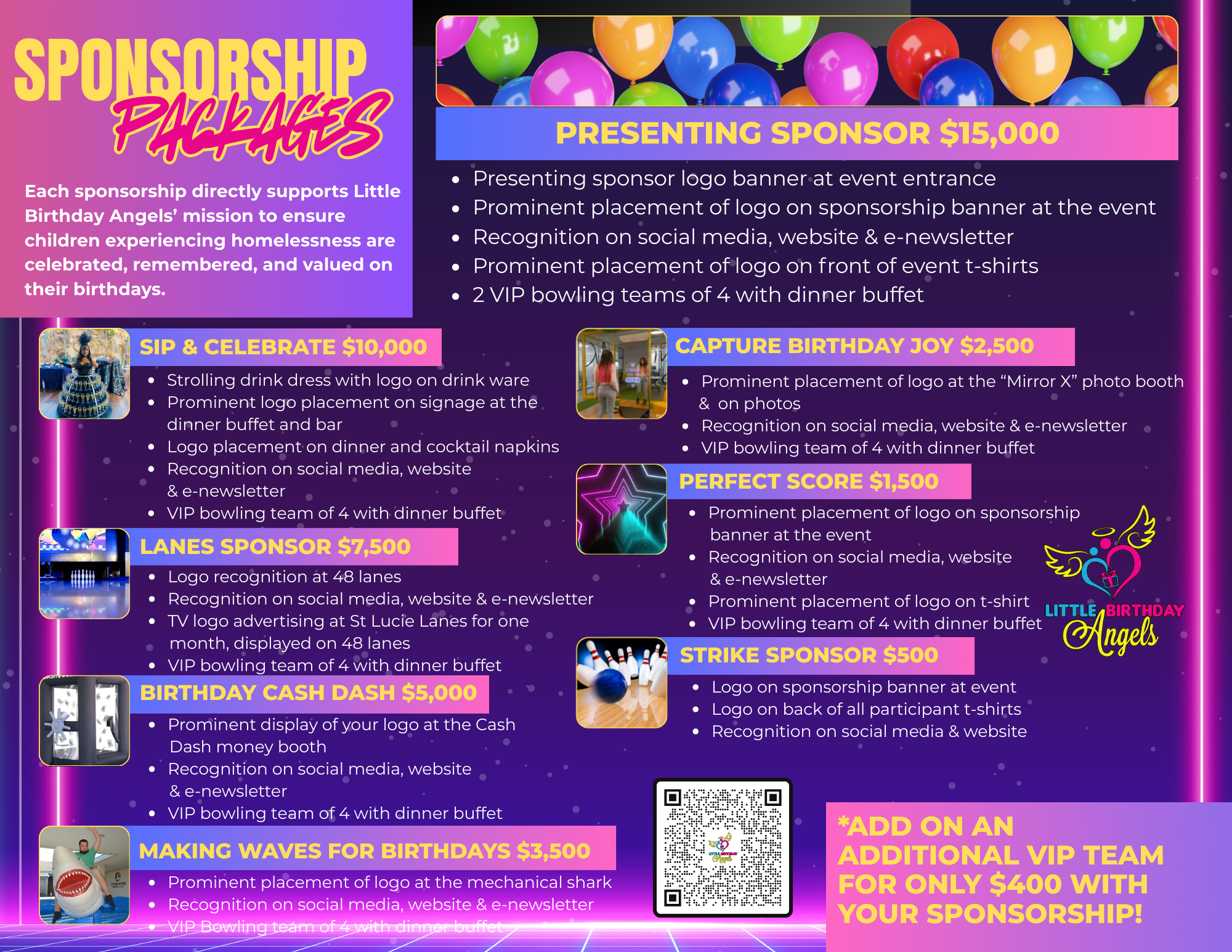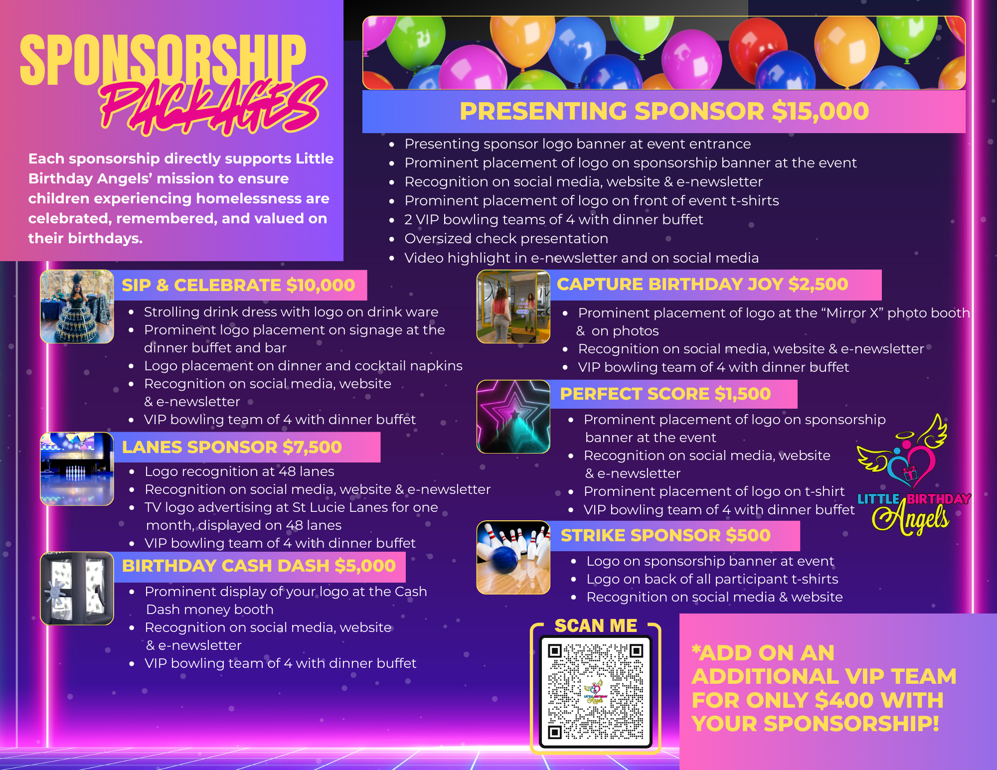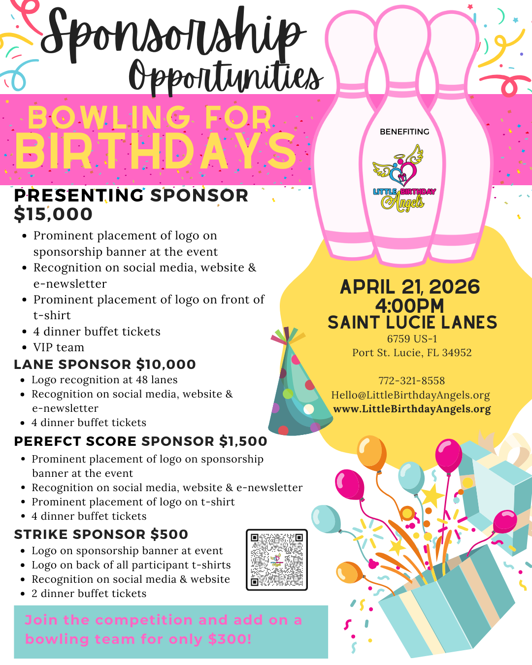 Join us on April 21, 2026 at 4:00 PM at St. Lucie Lanes for our annual Bowling for Birthdays fundraiser! Teams of four will compete in a fun bowling challenge—all to support Little Birthday Angels and help bring birthday joy to children experiencing homelessness in our community.